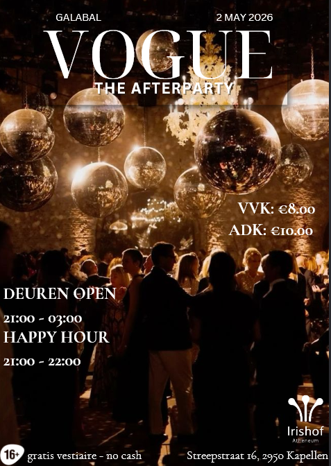 Op zaterdag avond 2 mei ben je vanaf 21u tot 3u welkom in de turnzaal voor het galabal van de 6de jaars. Vogue the afterparty. Happy hour tussen 21u en 22u. Inkom aan de kassa € 10,00.